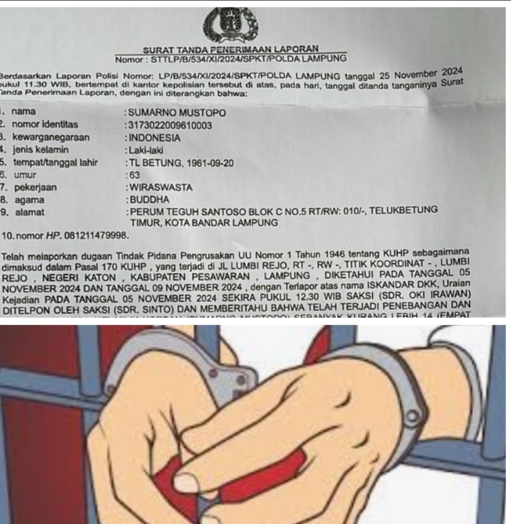 Dalam laporan nya ke polisi Sumarno Mustopa warga Teluk Betung, Bandar Lampung sesuai STPL ( surat tanda penerimaan laporan) No. STTLP. B.534/ XI/2024 SPKT Polda Lampung tanggal 25 November 2024.