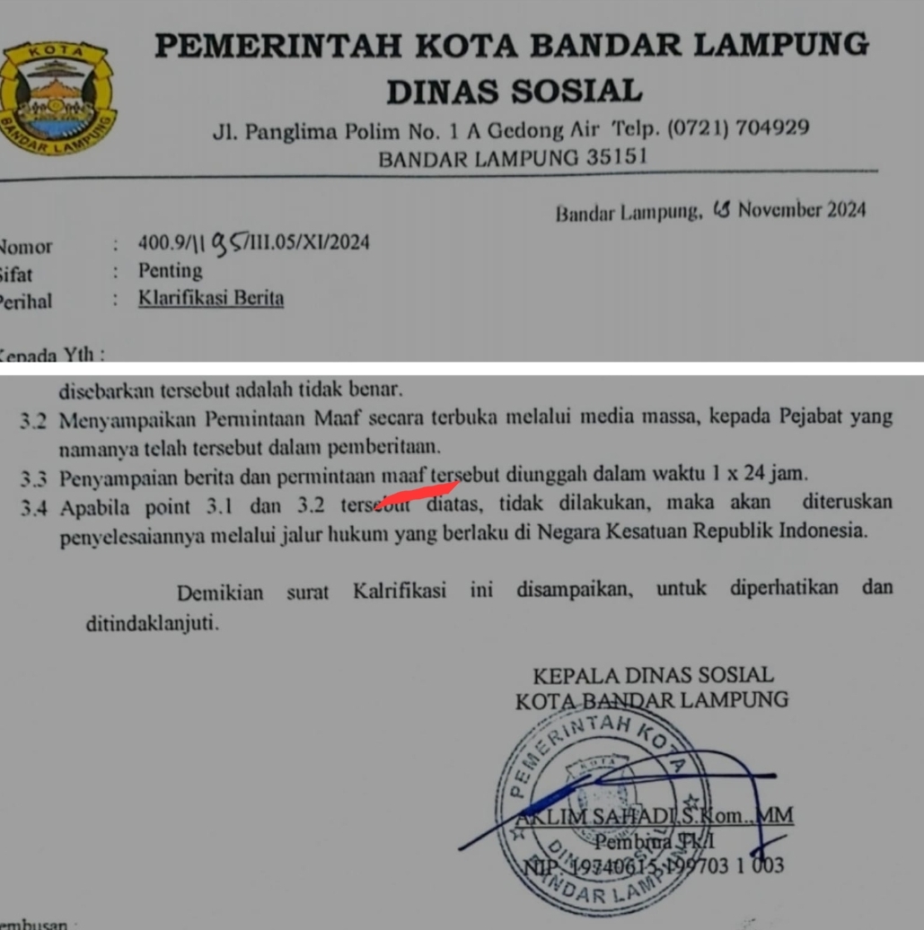 Demikian kami telah menayangkan Klarifikasi sesuai surat Kadis Sosial Bandar Lampung Aklim Sahadi. ( tim)