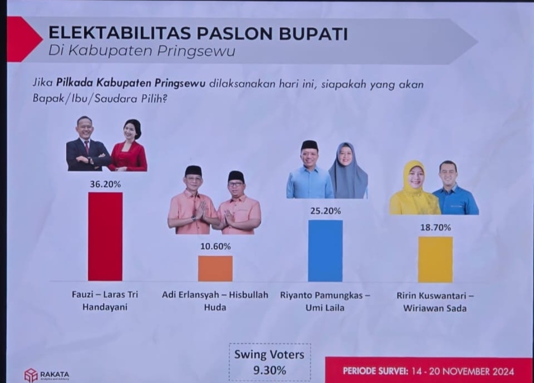 Pringsewu.Zeusnews.My.Id. – Hari pencoblosan pemilihan Bupati dan Wakil Bupati Pringsewu tinggal menghitung hari, hari ini hari terakhir kampanye, beberapa lembaga survai yang teruji seperti Rakata, di akhir kampanye hasil survai Fauzi – Laras menunjukkan telak menang dibandingkan calon lain.
