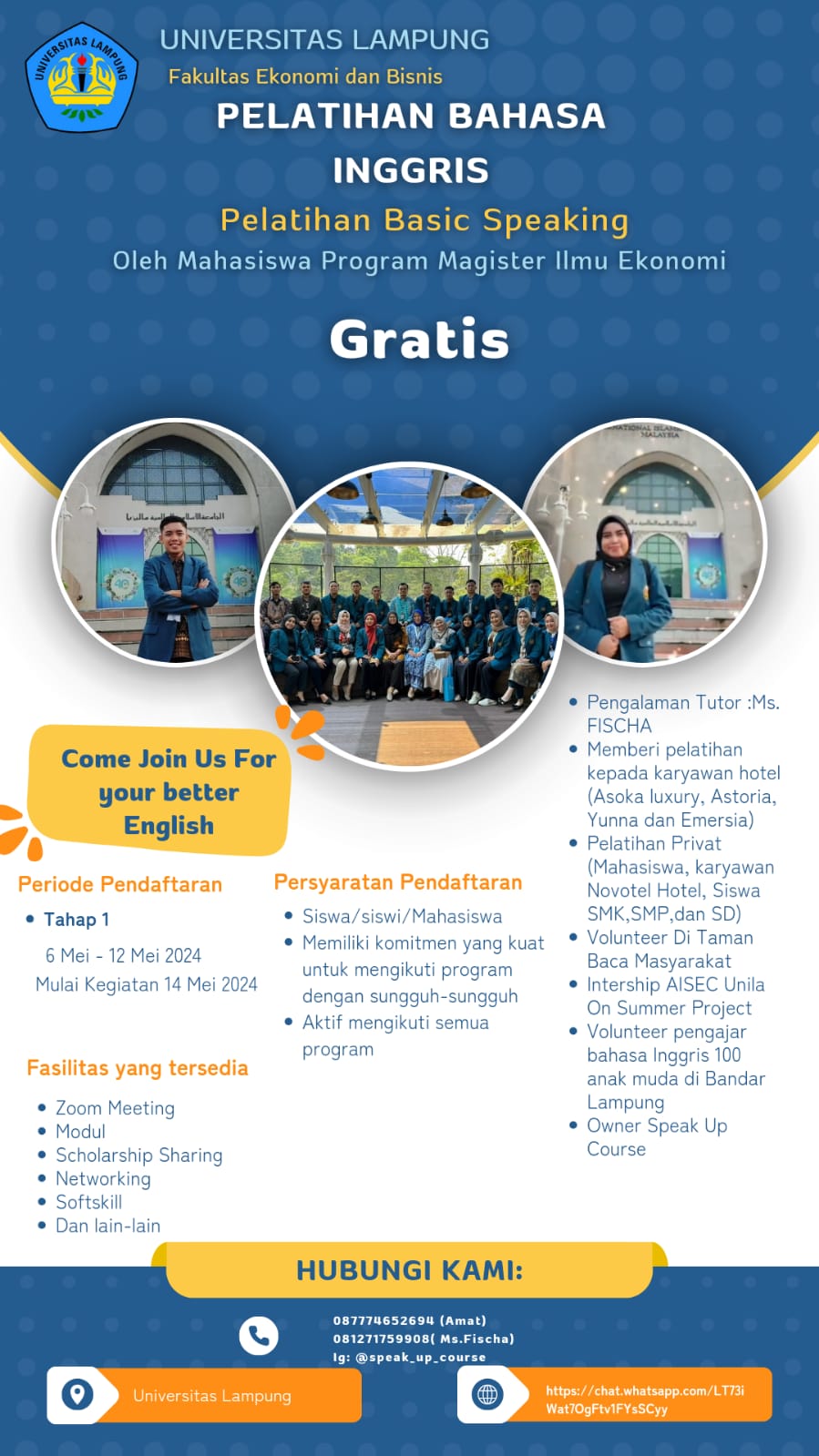 Program bahasa inggris dan informasi beasiswa ini bekerjasama dengan Universitas Lampung. Harapannya ini dapat bermanfaat untuk anak-anak SMA/SMK se-provinsi Lampung. Tahap pertama akan di buka pada tanggal 6 Mei 2024-12 Mei 2024, pendaftaran dibuka dan ini gratis. Kegiatan di mulai tgl 14 Mei 2024. Ayo di manfaatkan.. (red)