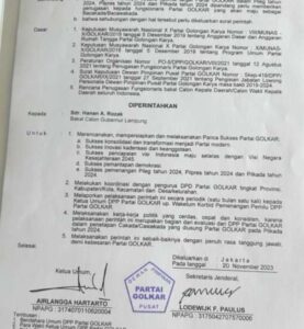 “Kalau melihat, tanggal terbitnya Surat Perintah DPP Partai Golkar yakni 20 November 2023, jelas adanya surat ini tidak ada kaitan dengan hasil Pileg di Lampung,” jelas Ismet Roni.