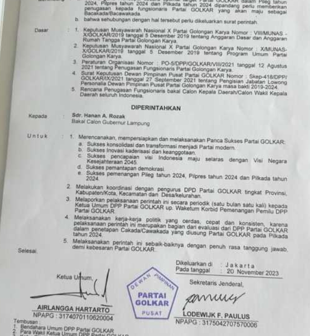 Dikonfirmasi terpisah Sekretaris DPD Partai Golkar Provinsi Lampung, H. Ismet Roni, S.H., M.H., mengaku baru mendengar adanya Surat Perintah DPP Partai Golkar kepada Saudara Hanan A. Rozak sebagai Bakal Calon Gubernur Lampung.